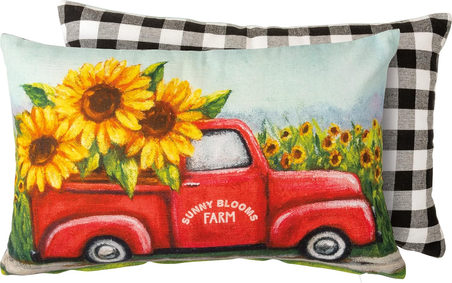 A double-sided cotton pillow featuring a whimsical design of a truck hauling oversized sunflowers on the front. Design is replicated from original artwork painted onto burlap canvas, giving the art a unique depth and texture. Back features black and white buffalo check pattern. Includes zipper to easily remove and clean cover. Polyester filling. Shipped vacuum-sealed for protection and storage.